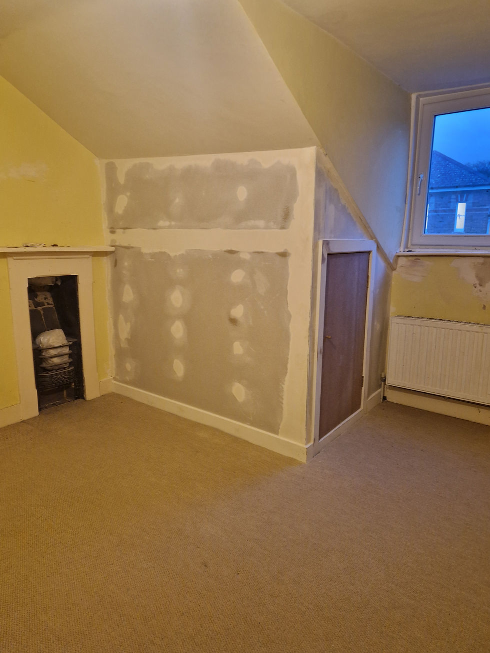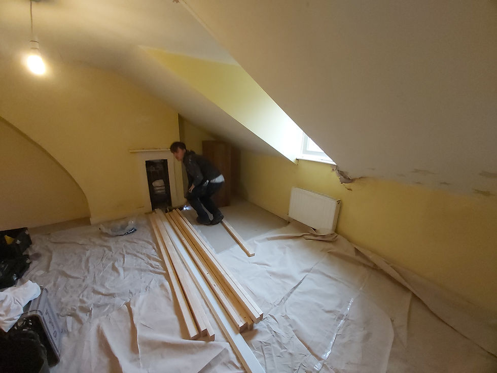 A little more about the project: the ceiling had some movement cracks, as is normal in old buildings - movement can occur. We used a specialist flexible product and then skimmed over it ready for sanding, to "feather it in" (in other words to blend it in so its not noticeable). There were also some more substantial areas of lose plaster and holes that required filling and bonding plaster. This is a gritty rough "undercoat plaster" used for filling larger holes, with a few tips of the trade using this product can help to save time. The client had also requested a (studwork and plasterboard) new loft cupboard to be built - for storage. We also provided a quotation to paint the entire room, but the client opted to do this herself. We were more than happy to tackle the more major aspects of the work - working within her budget.